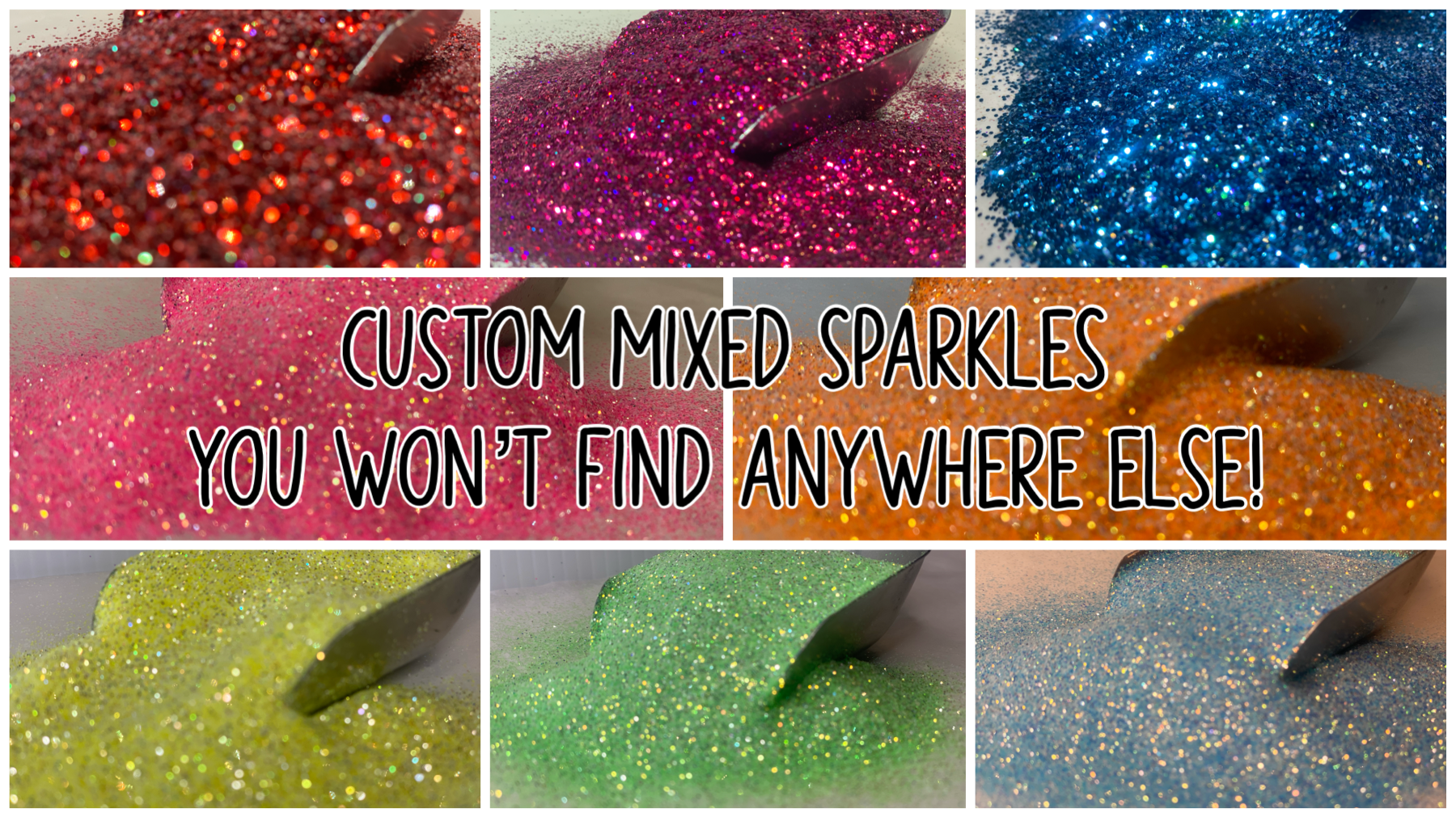 12 custom mixed glitters that are unique to Sparkles Glitter with Jelby...